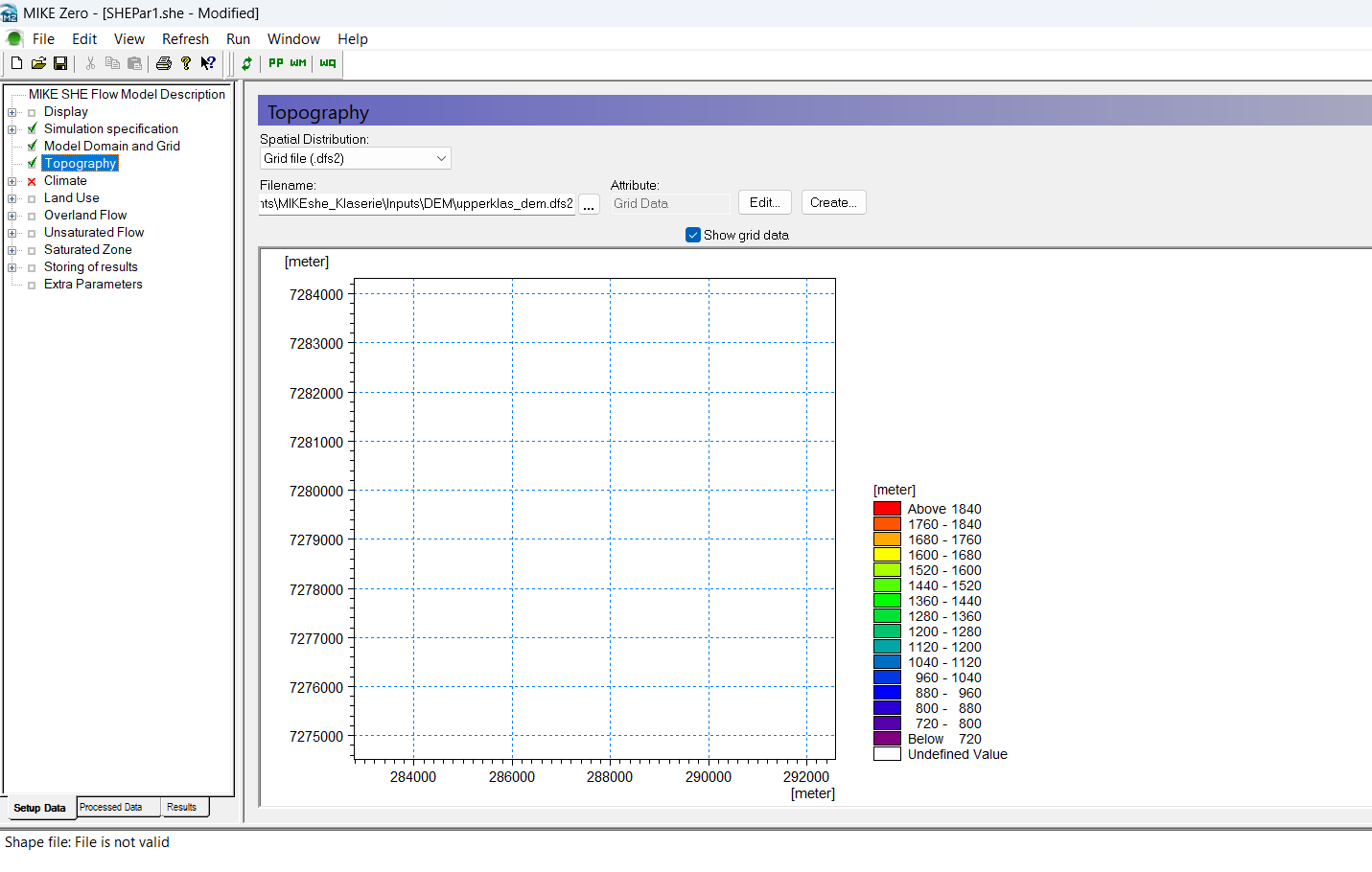 I am new to MIKESHE and I am having an issue with my catchment shapefile, i am using UTM coordinates and for my shapefile and also set the model domain to WGS84 UTM 36S.I also selected meters, how ever i get a message sating "shapefile invalid" and i have a similar error with my DEM it doesnt even appear on the grid.